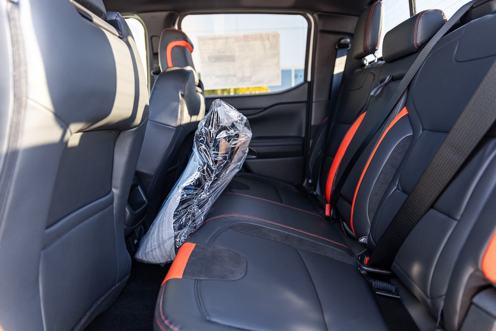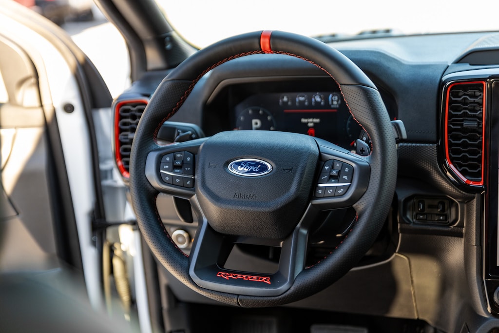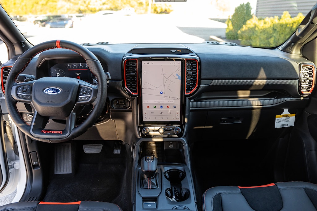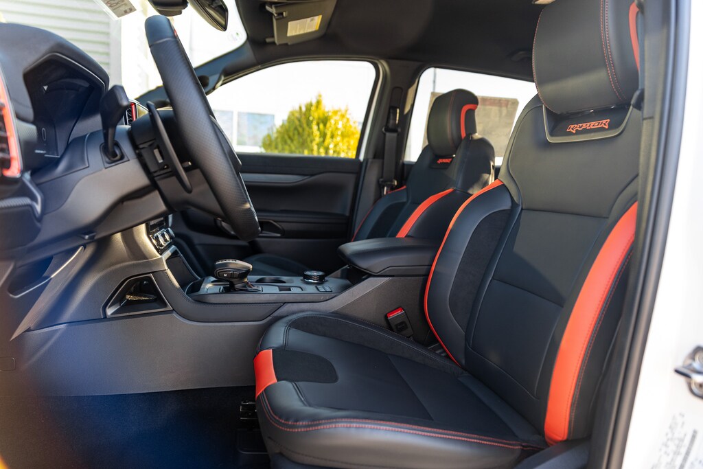 Inside, the 2025 Ranger Raptor offers a bold yet refined cabin designed for both comfort and command. The interior features deeply bolstered sport seats with Raptor-exclusive stitching, a leather-wrapped steering wheel with magnesium paddle shifters, and premium materials throughout. Heated front seats, dual-zone automatic climate control, and ample storage make it both rugged and refined for everyday use.