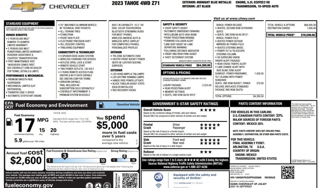 2023 Chevrolet Tahoe Z-71 4x4 SUV V8 DI Dyn Fuel Mgmt